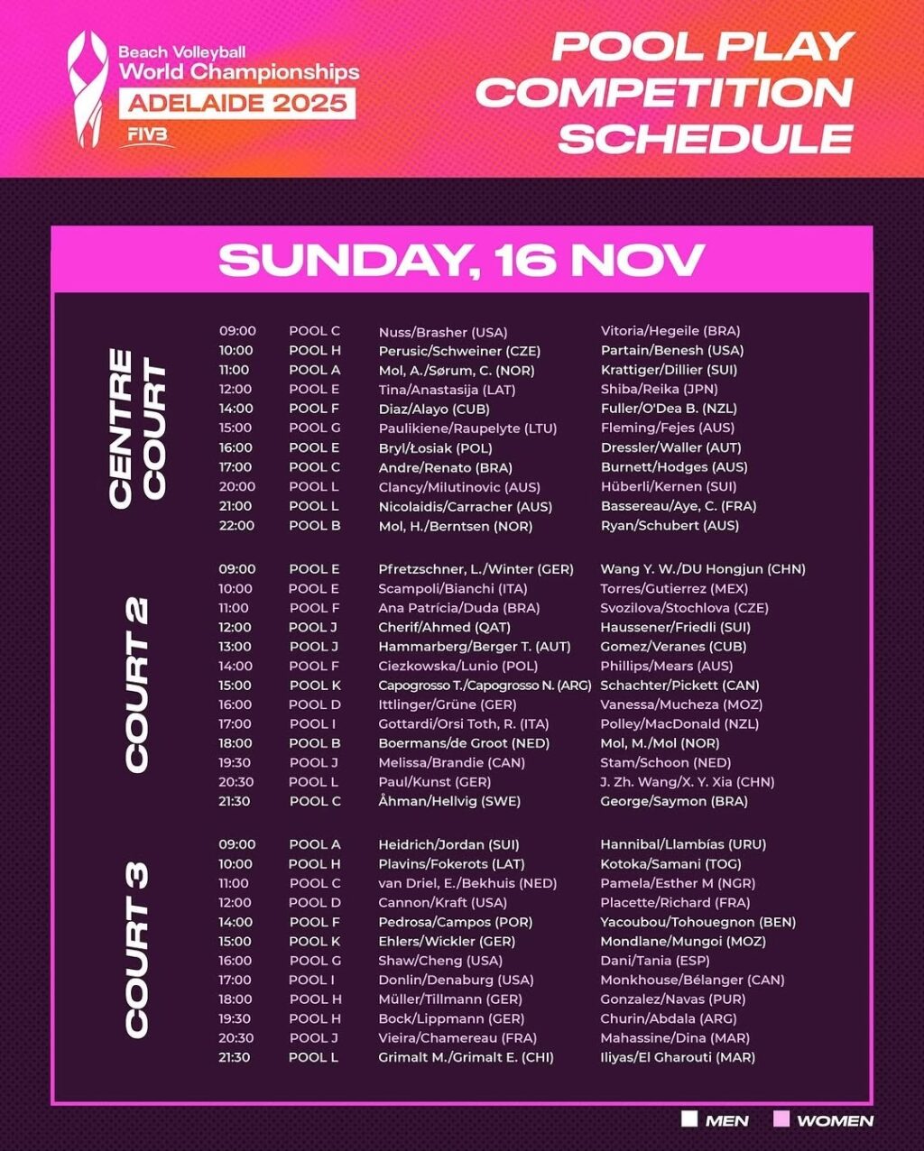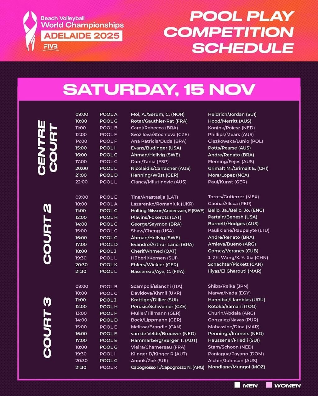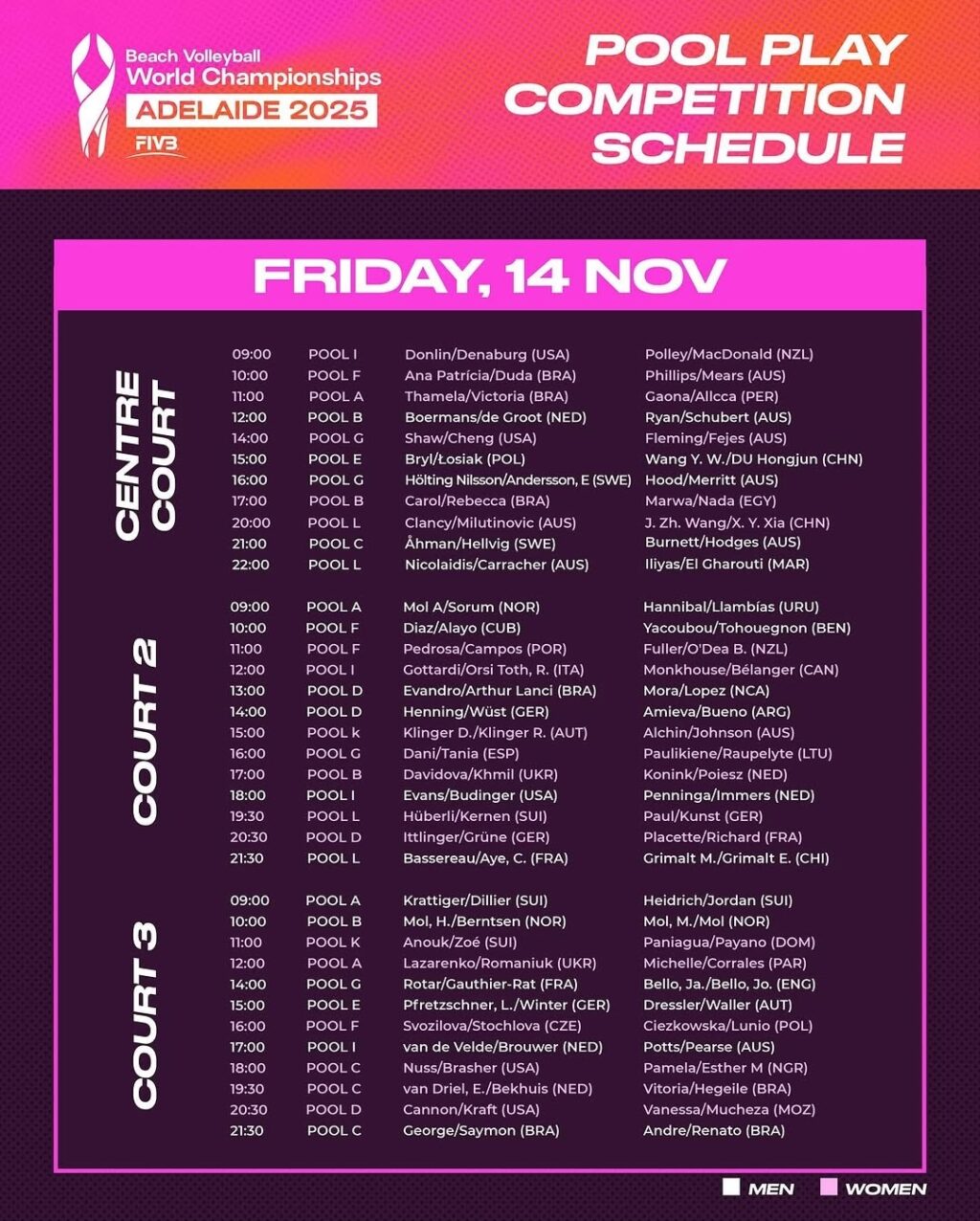 Чемпионата мира FIVB по пляжному волейболу 2025 года пройдет в Аделаиде с 14 по 23 ноября.