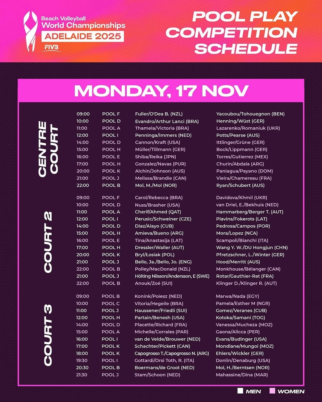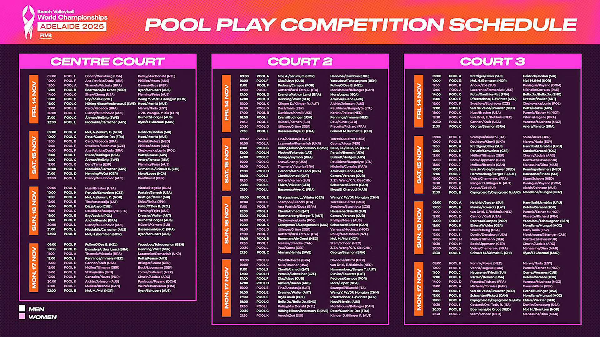Чемпионата мира FIVB по пляжному волейболу 2025 года пройдет в Аделаиде с 14 по 23 ноября.
